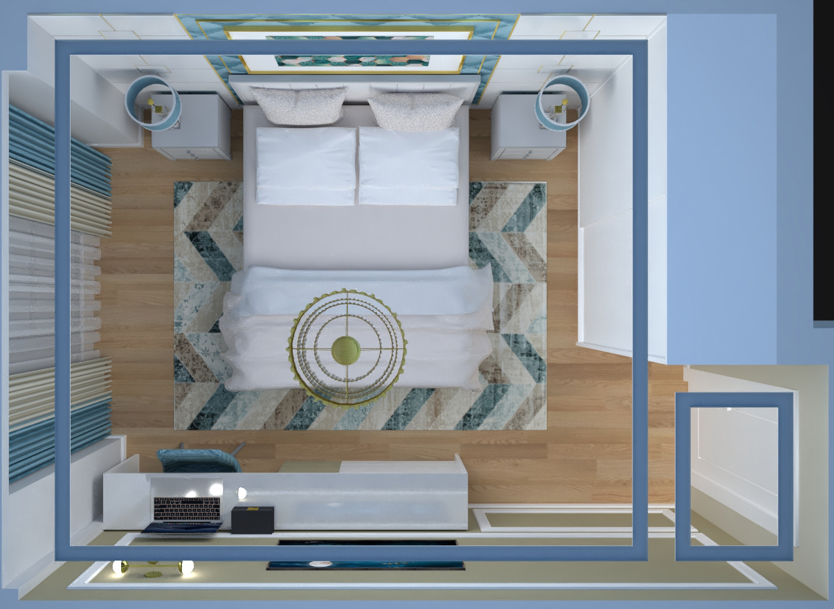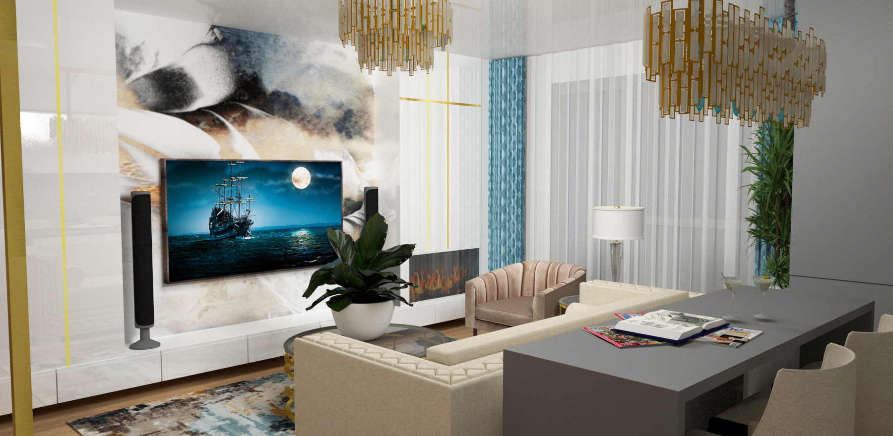 Materiale folosite: parchet triplu strat, mobilier Mdf lucios cu insertii baghete aurii, placari pereti Mdf lucios cu auriu, panou decorativ auriu, fototapet, vopsea superlavabila, decorativa.
