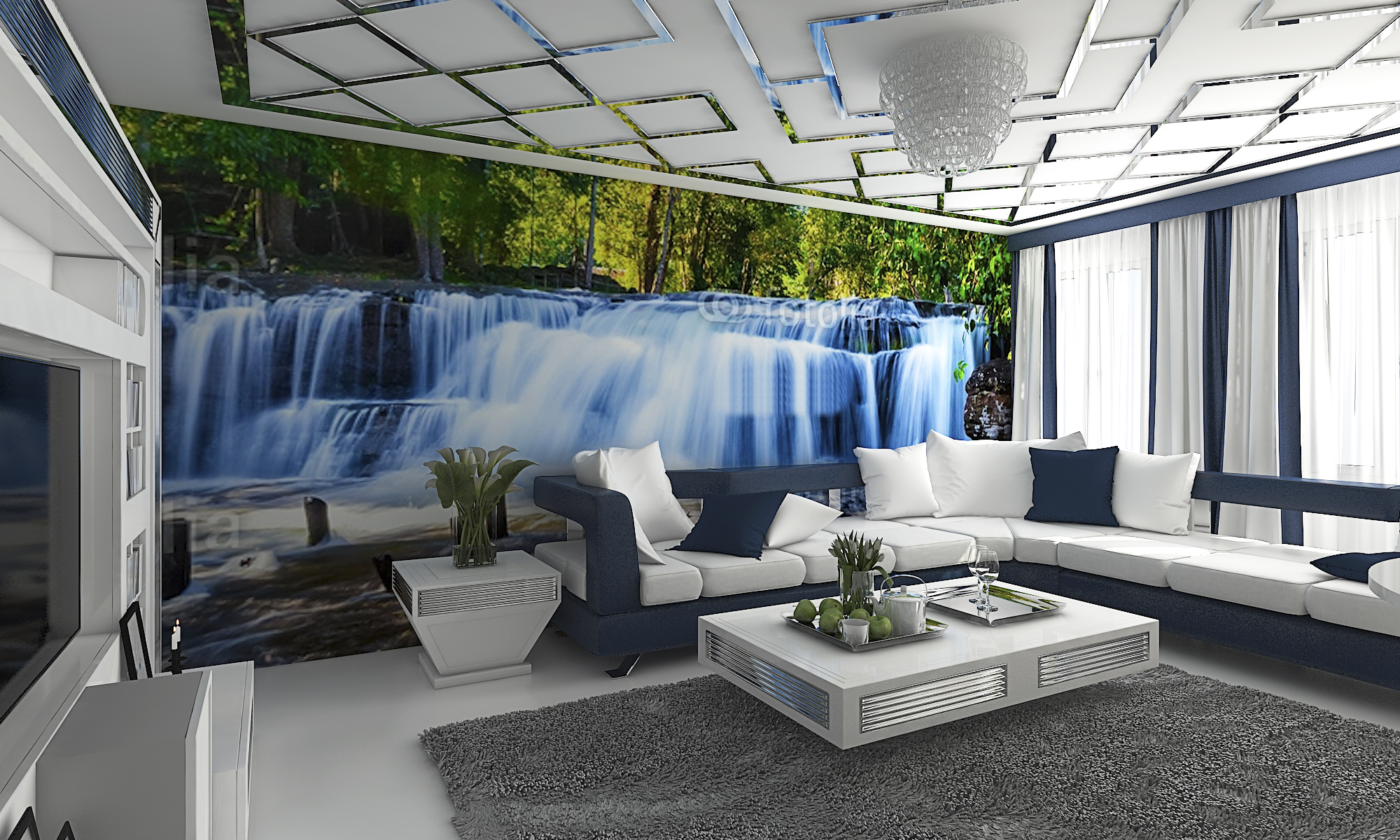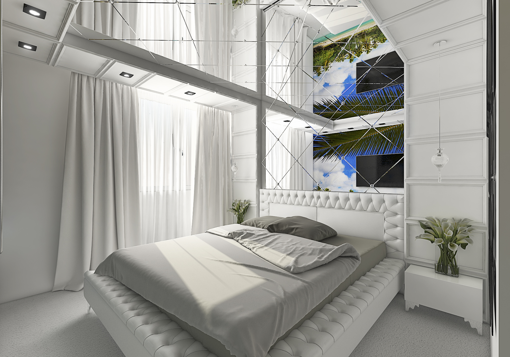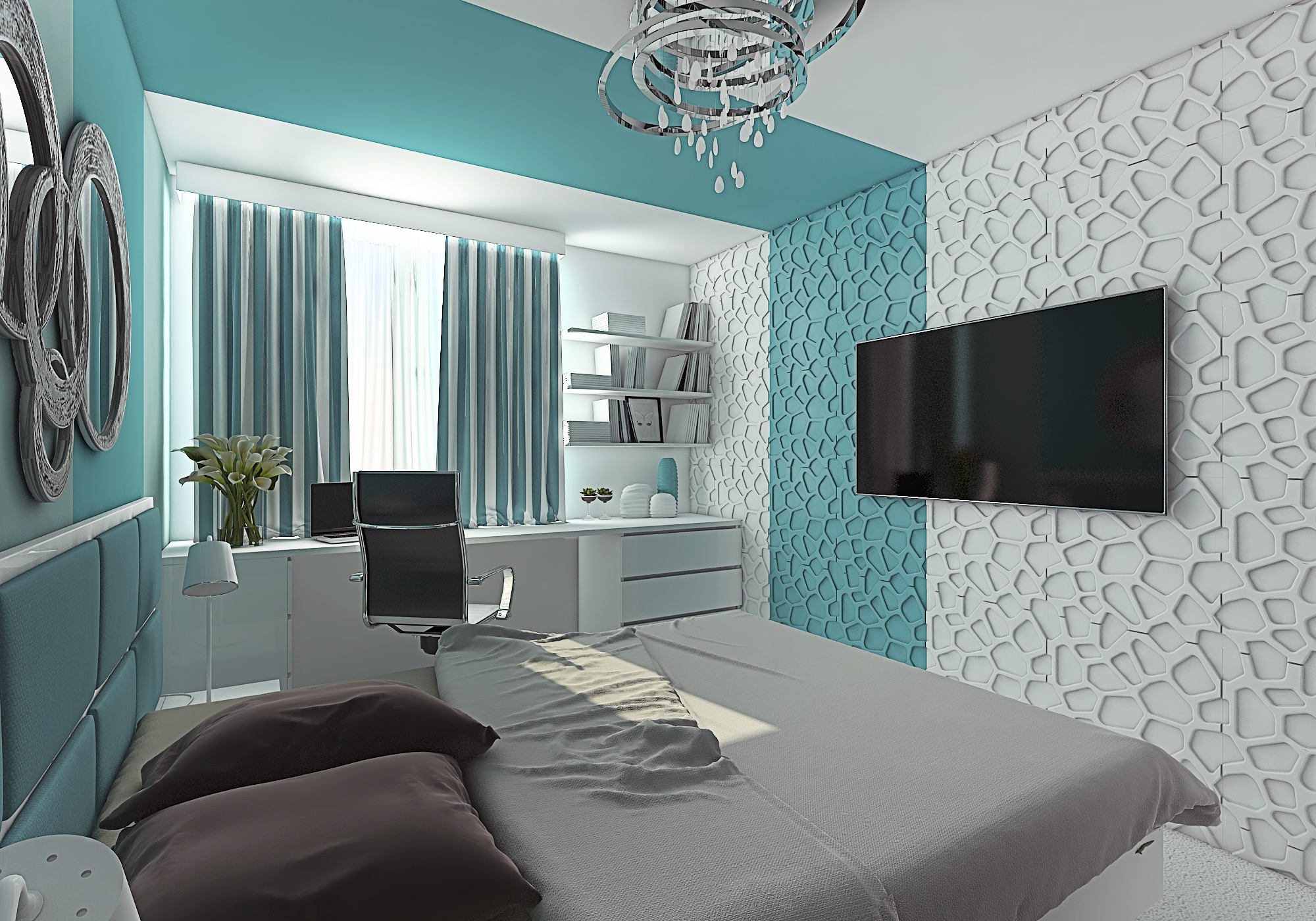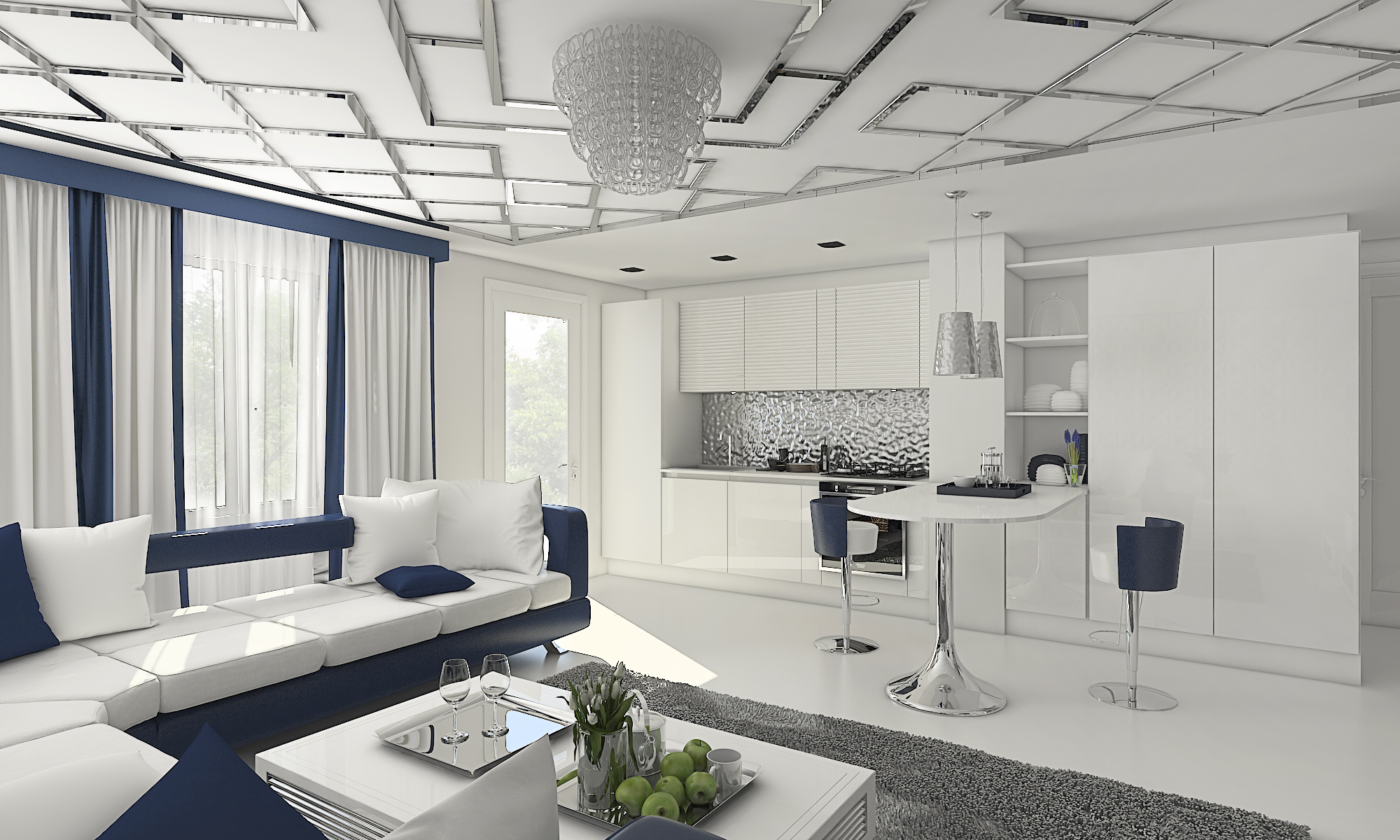Albul cu accente de albastru sunt culorile predominante in aceasta amenajare. Pentru a nu aparea totul prea diafan din cauza culorii albe am creat si cateva puncte de interes. S-au folosit pe perete placi 3D in loc de un simplu tapet, pe tavan s-a mers cu aplicatii din inox, la bucatarie intre corpuri s-a folosit o placare realizata manual din inox spercial tratata pentru zone de bucatarie.
