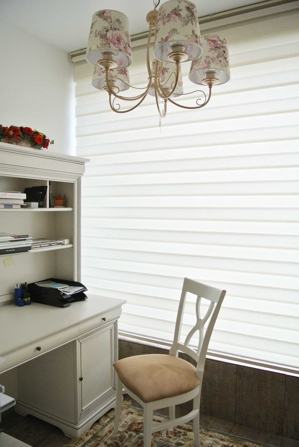 Deoarece biroul este amplasat langa geam, in functie de momentul zilei, lumina poate deveni deranjanta. Pentru a preveni acest lucru, la fereastra a fost montata o jaluzea tip roman. Astfel, lumina va patrunde difuz in camera dedicata studiului.